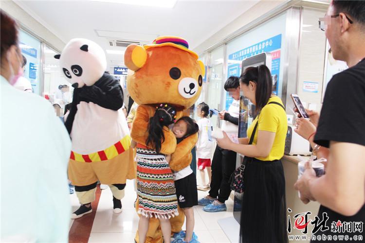 在候診大廳看到醫(yī)院工作人員裝扮的布朗熊和功夫熊貓,孩子們興奮不已,各個洋溢著歡樂的笑臉;顒右婚_始,“布朗熊”就用溫和的話語給小朋友們解釋自己身上的疾病,舒緩皮膚病患兒的自卑。“這種病完全不會傳染給別人,小朋友們不要自卑,不要覺得這是自己的缺陷。每個人都會生病,很多小朋友的病情都可以得到有效控制,并且逐漸復(fù)色!