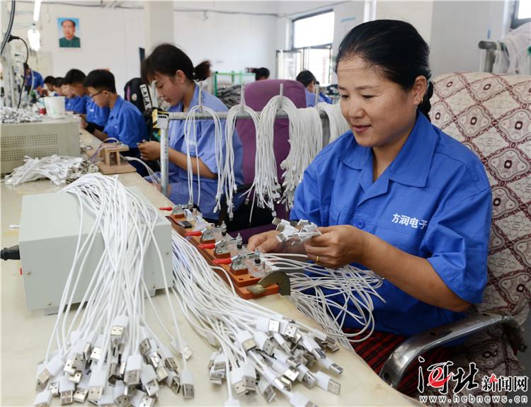 在望都縣方潤電子設(shè)備有限公司的扶貧車間內(nèi),工人在進行數(shù)據(jù)線注塑。通訊員張潔攝