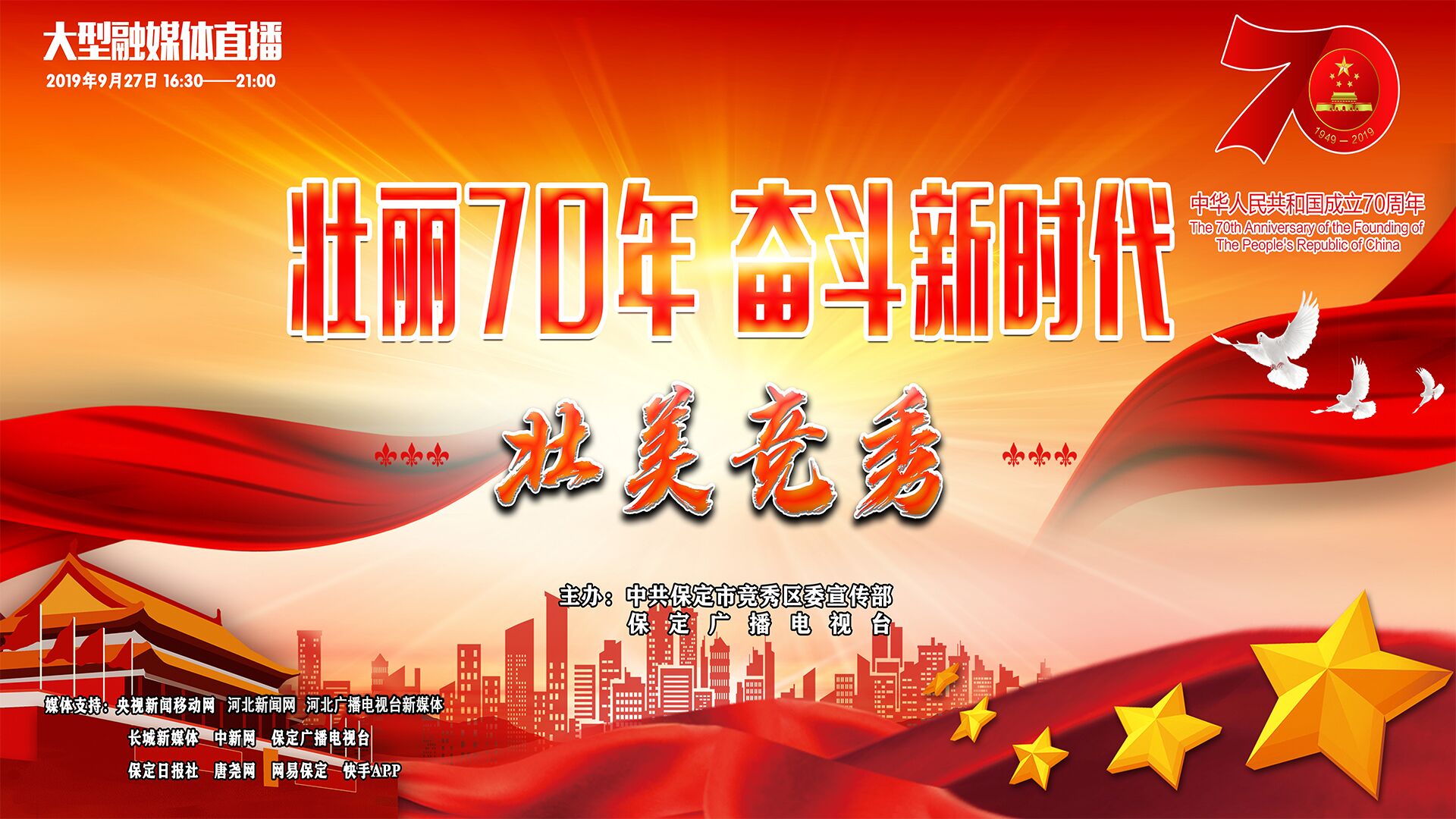 壯麗70年, 奮斗新時代,由中共保定市競秀區(qū)委宣傳部、保定廣播電視臺聯(lián)合推出的大型融媒體直播節(jié)目——“壯美競秀”今天與您見面。屆時,央視新聞移動網、長城新媒體、河北新聞網、中新網、保定廣播電視臺手機臺、保定廣播電視臺“在保定”APP、保定廣播電視臺公共頻道“保定創(chuàng)城”微信公眾號、保定日報社、唐堯網、網易保定、快手APP十二家網絡媒體平臺進行同步直播。16點半至21點半,五個小時、七個地點的不間斷直播,將為您展現(xiàn)競秀區(qū)時代發(fā)展的強勁脈搏!