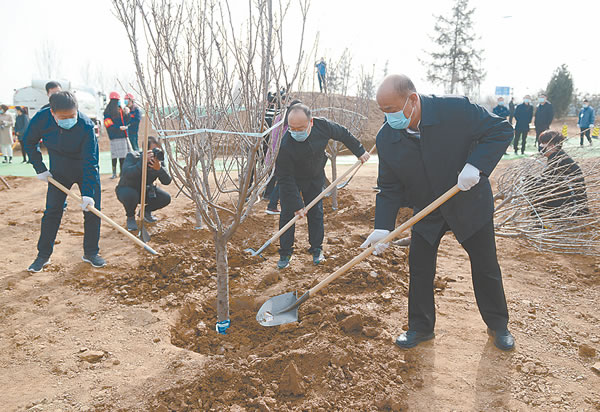 3月12日,市委書記聶瑞平等市四大班子領(lǐng)導(dǎo)來到北三環(huán)蓮池區(qū)百樓鄉(xiāng)南常保村東,參加義務(wù)植樹活動。 記者高欣悅攝