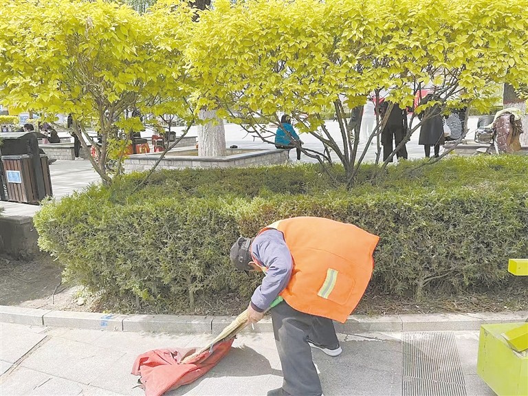 環(huán)衛(wèi)工人清理綠化帶垃圾。薛梅攝