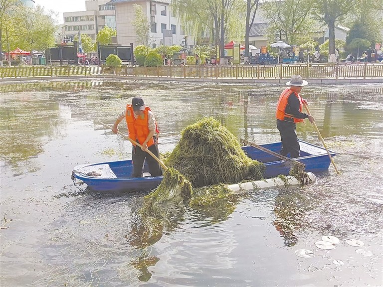 環(huán)衛(wèi)工人乘漁船,清理拒馬源廣場(chǎng)水面垃圾及水草。