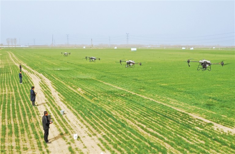 定興縣固城鎮(zhèn)北店村土地專業(yè)合作社的高標(biāo)準(zhǔn)農(nóng)田里,技術(shù)人員操作無人機(jī)統(tǒng)一進(jìn)行噴藥作業(yè)。張?jiān)紨z