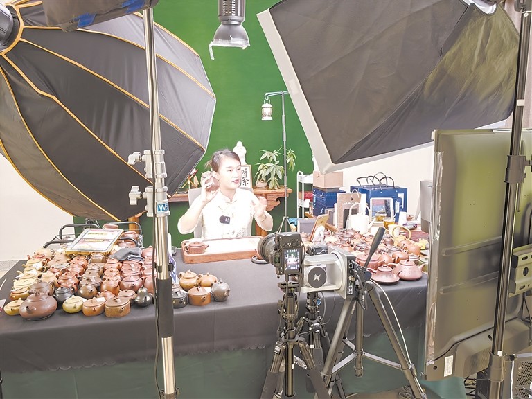 比賽現(xiàn)場(chǎng),參賽團(tuán)隊(duì)正在直播銷售陶瓷茶具。陳燁璠攝