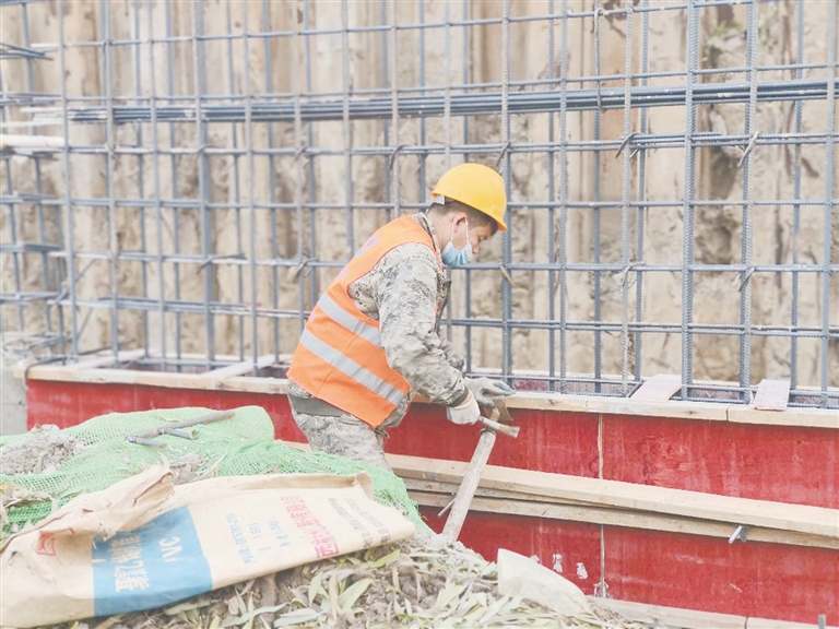 環(huán)城水系二期府河婦幼保健院段,施工人員正在修建新的擋土墻。郝子帥攝