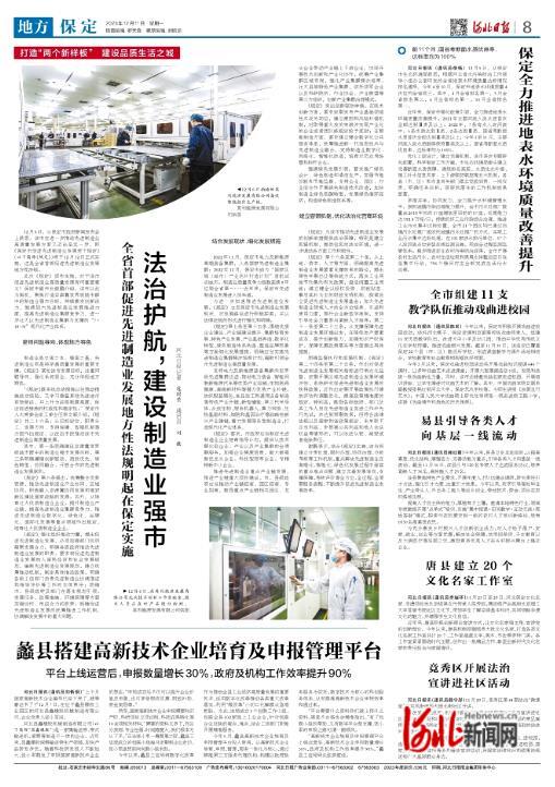 12月6日,從保定市政府新聞發(fā)布會上獲悉,該市在進一步推動先進制造業(yè)高質(zhì)量發(fā)展方面又邁出堅實一步,即《保定市促進先進制造業(yè)發(fā)展若干規(guī)定》(以下簡稱《規(guī)定》)將于12月12日正式實施。這是全省首部促進先進制造業(yè)發(fā)展地方性法規(guī)。
