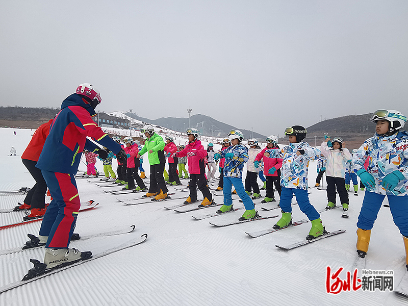 2月4日,在淶源縣七山滑雪場,馬蘭花兒童聲合唱團成員在教練指導下學習滑雪技能。 河北日報記者 張 鏡攝