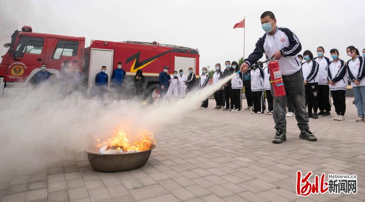 2022年5月10日,河北省黃驊市李村中學(xué)學(xué)生在使用滅火器滅火。