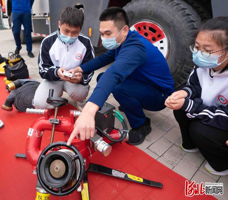 2022年5月10日,消防隊(duì)員為同學(xué)們介紹消防設(shè)備。通訊員張國文攝影報(bào)道