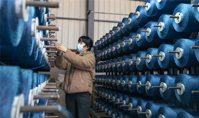 4月13日,在河北省黃驊市舊城鎮(zhèn)一家小微企業(yè),工人在整理生產(chǎn)地毯的絲線。