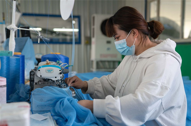 4月13日,在河北省黃驊市舊城鎮(zhèn)一家小微企業(yè),工人在加工出口非洲的蚊帳。