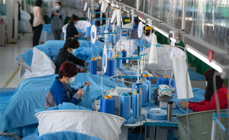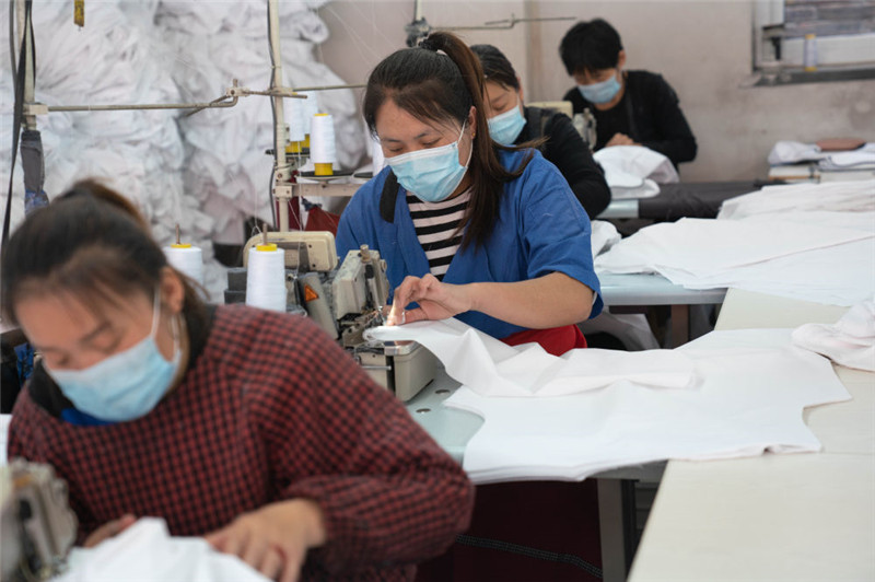 4月13日,在河北省黃驊市舊城鎮(zhèn)一家小微企業(yè),工人在加工出口美國(guó)的服裝。