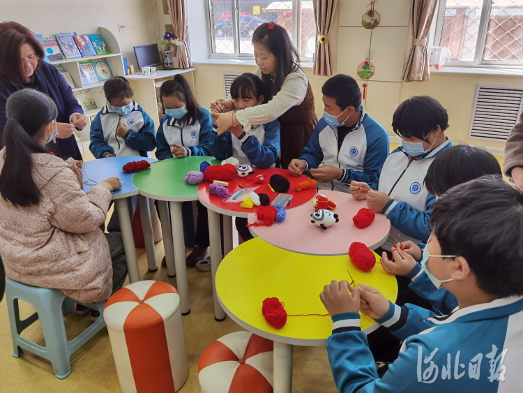 泊頭市特教學(xué)校的學(xué)生們?cè)诶蠋煹闹笇?dǎo)下,用毛線手工鉤織北京2022年冬殘奧會(huì)吉祥物“雪容融”。河北日?qǐng)?bào)通訊員 田志峰 攝