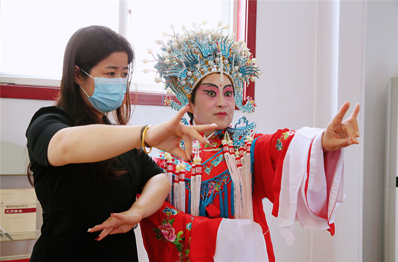 在河北省黃驊市滕莊子鎮(zhèn),演員正在示范戲曲手勢。