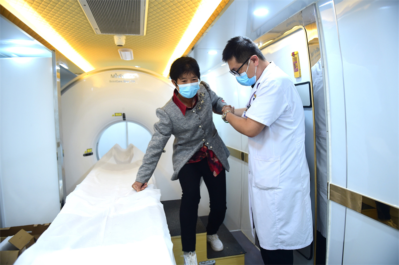 9月25日,滄州中西醫(yī)結(jié)合醫(yī)院放化療中心醫(yī)生在“移動CT”室內(nèi)為群眾進(jìn)行肺部影像檢查。新華社發(fā)(傅新春 攝)