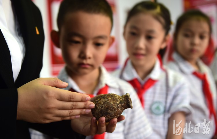 9月23日,滄州博物館工作人員向滄州市上海路小學(xué)的孩子展示八路軍使用過的手雷。