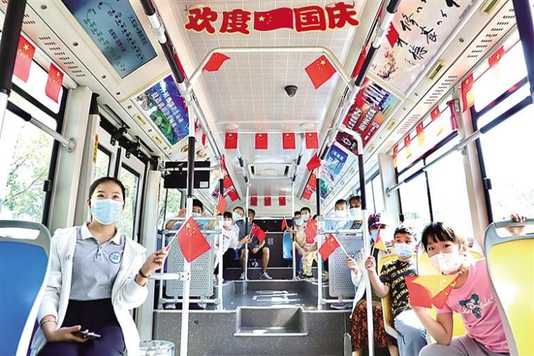 為迎接黨的二十大勝利召開(kāi),在國(guó)慶節(jié)到來(lái)之際,滄州公交車長(zhǎng)對(duì)公交車精心裝扮,在車廂頂部及燈箱片上方懸掛起五星紅旗及“歡度國(guó)慶”字樣條幅,車廂內(nèi)洋溢著熱烈莊重的節(jié)日氣氛。不時(shí)有乘客拍照留念,一些小學(xué)生還認(rèn)真地敬起了少先隊(duì)禮。劉文環(huán)、陳雷攝影報(bào)道