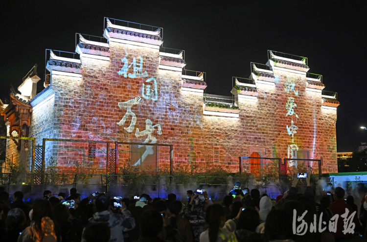 10月4日,百獅園內(nèi)一面江南風(fēng)格的建筑外墻,變身為投影“大屏幕”,增添了濃濃的節(jié)日氛圍。