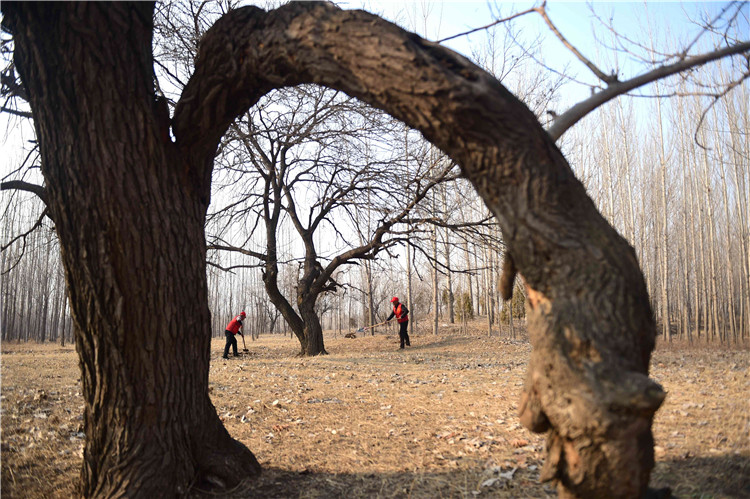 2月23日,孟各莊古桑樹巡護(hù)隊(duì)的隊(duì)員清除古桑樹下的垃圾與雜草。