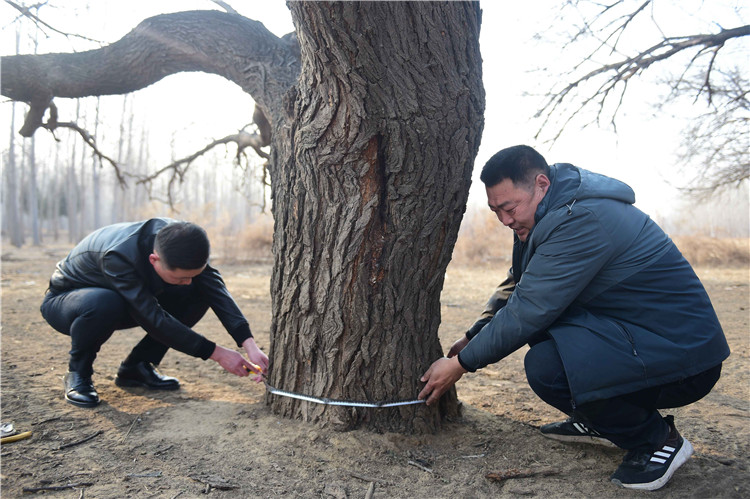 2月23日,獻(xiàn)縣自然資源和規(guī)劃局工作人員(左)在村民的協(xié)助下對(duì)古桑樹進(jìn)行測(cè)量。