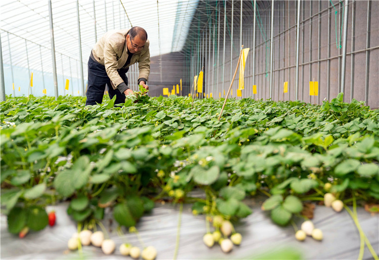 2月11日,農(nóng)戶在河北滄州渤海新區(qū)黃驊市一處農(nóng)業(yè)科技示范園管護草莓。