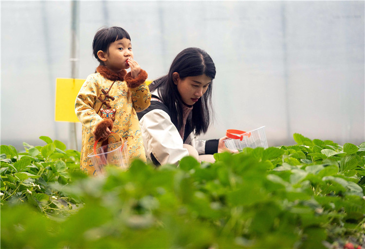 2月11日,游客在河北滄州渤海新區(qū)黃驊市一處農(nóng)業(yè)科技示范園采摘草莓。