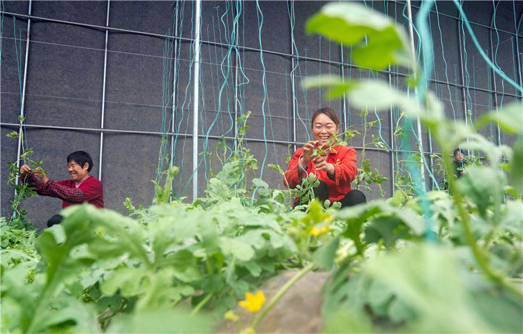 2月11日,農(nóng)戶在河北滄州渤海新區(qū)黃驊市一處農(nóng)業(yè)科技示范園為西瓜秧整枝。