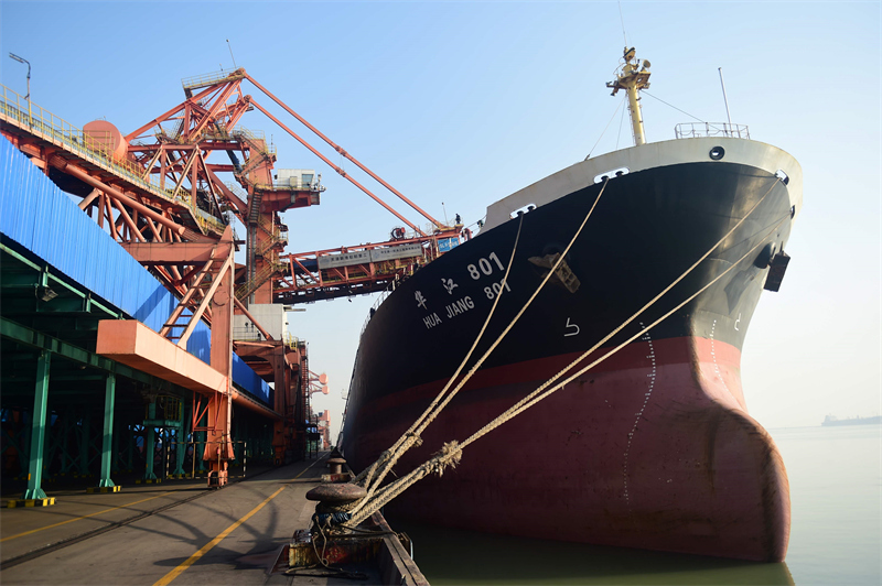 1月8日,船舶在黃驊港碼頭裝運煤炭。