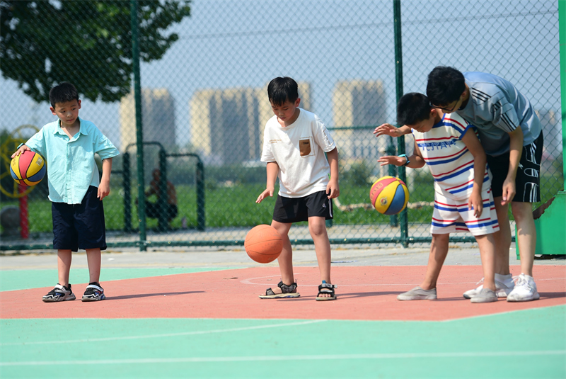 7月10日,在河北滄州,志愿者周義帛(右一)教建設(shè)大街社區(qū)的孩子打籃球。