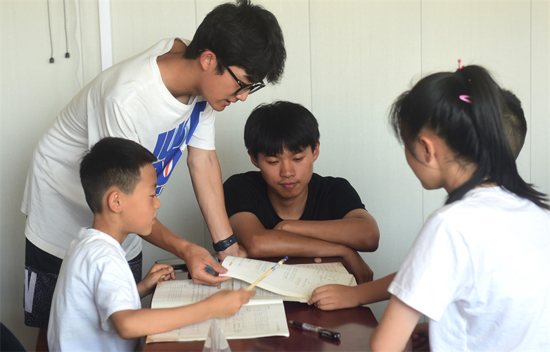 7月10日,在河北滄州,志愿者張志豪(中)為東姜官屯村兩名學(xué)生講解數(shù)學(xué)題。新華社記者 王民 攝