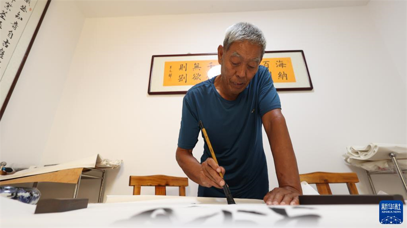 8月22日,老人在青縣曹寺鎮(zhèn)曹寺村的孝老食堂練習(xí)書法。
