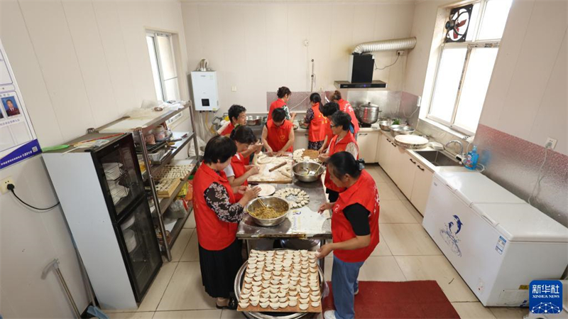 8月22日,青縣金牛鎮(zhèn)大鵓鴿留村孝老食堂的志愿者準(zhǔn)備餐食。