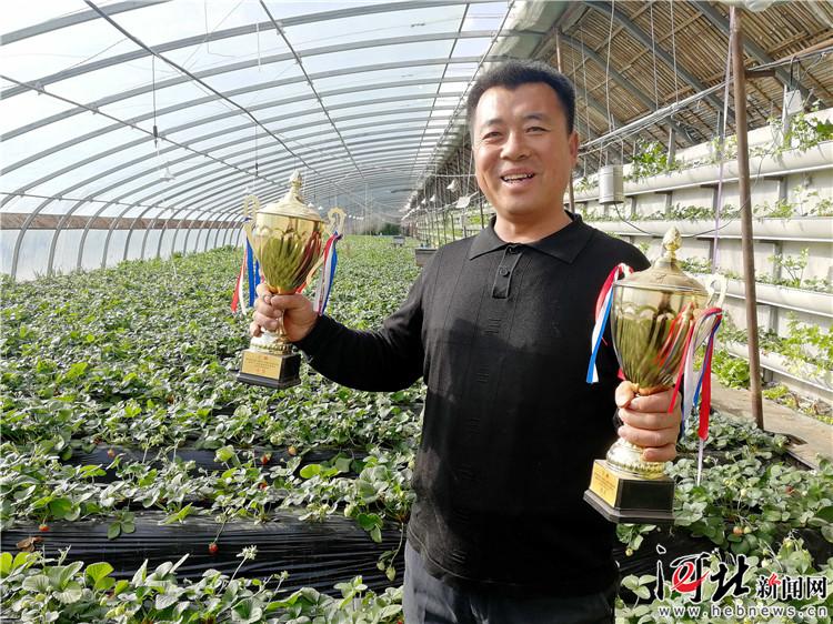 近日,巨立采摘園的負責(zé)人呼巨立展示在全國精品草莓擂臺賽上獲得的獎杯。記者陳寶云攝