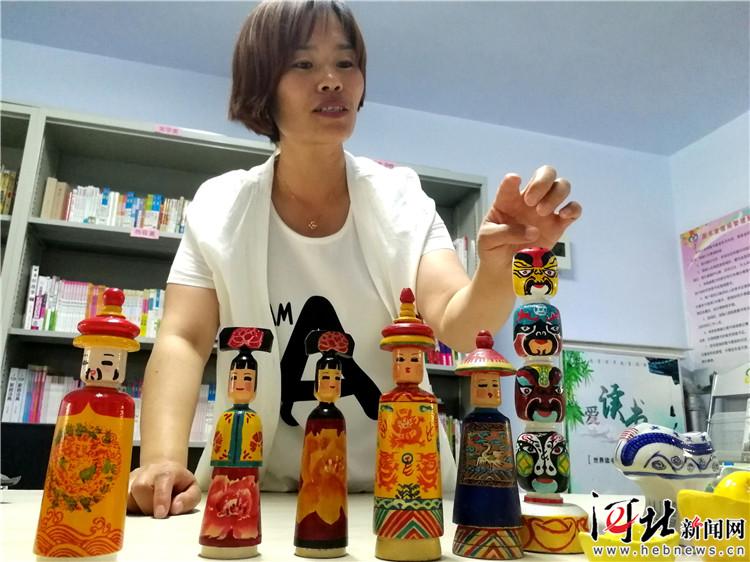 近日,雙灤區(qū)楓林綠洲社區(qū)副主任滕麗杰展示由居民制作的一組滿族人物木雕文創(chuàng)產(chǎn)品。記者陳寶云攝