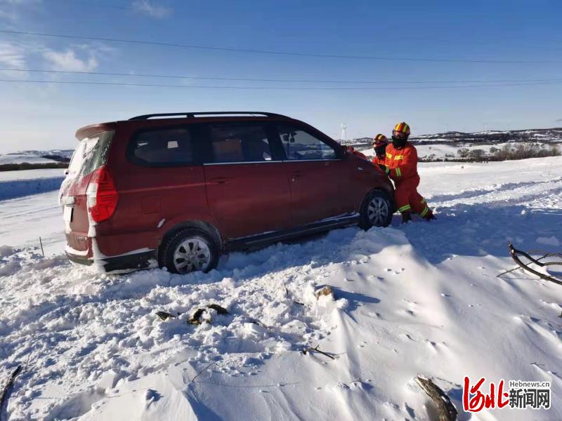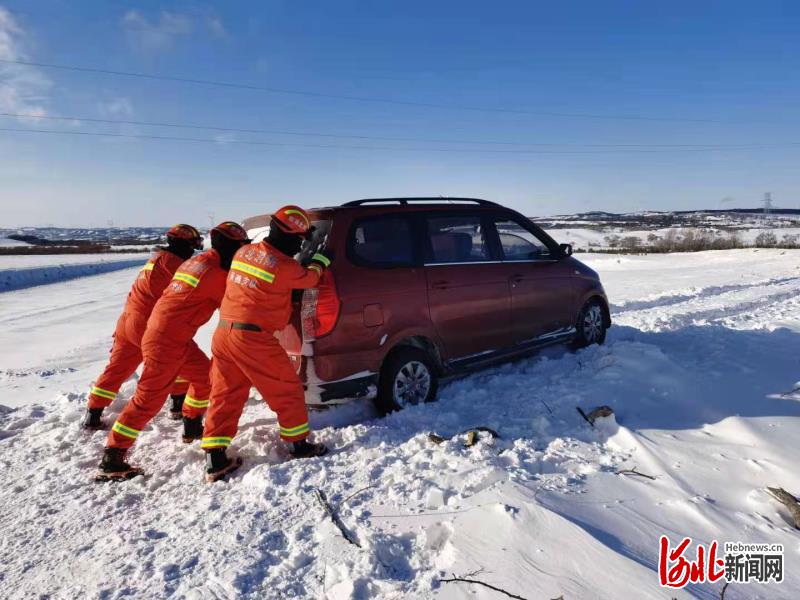 圖為河北省承德消防圍場滿族蒙古族自治縣御道口牧場消防指戰(zhàn)員幫助因積雪被困車輛解困。