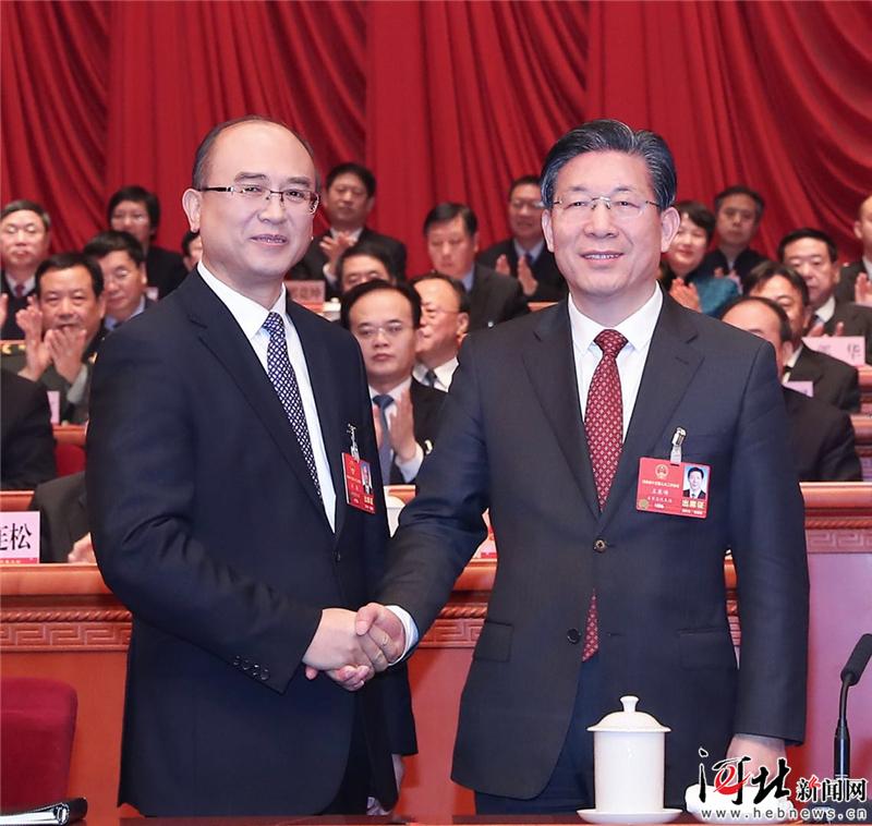 1月14日上午,河北省第十三屆人民代表大會(huì)第二次會(huì)議在省會(huì)河北會(huì)堂開(kāi)幕。許勤作政府工作報(bào)告后,王東峰與許勤握手。  記者趙海江 田明攝
