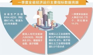 全省生產(chǎn)總值8164.4億元,同比增長7.4%,增速為近5年來最快;居民人均可支配收入6636元,同比增長8.9%,增速高于全國、高于預(yù)期;規(guī)模以上工業(yè)戰(zhàn)略性新興產(chǎn)業(yè)增加值同比增長16.8%,高于規(guī)模以上工業(yè)增加值增速8.0個百分點;一季度末全省法人單位130.7萬個,同比增長14.0%……