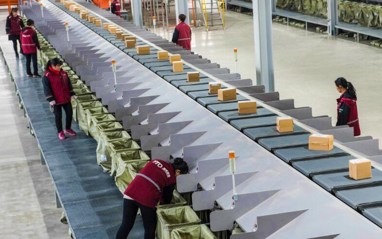 3月19日,棗強(qiáng)縣肖張鎮(zhèn)一家物流公司的工人在快遞包裹分揀流水線上作業(yè)(無人機(jī)拍攝)。 新華社記者李曉果攝