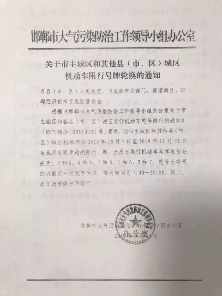 邯鄲市機(jī)動(dòng)車限行尾號(hào)輪換,10月8日起,執(zhí)行。上班第一天,周二(10月8日)限行尾號(hào)4和9。