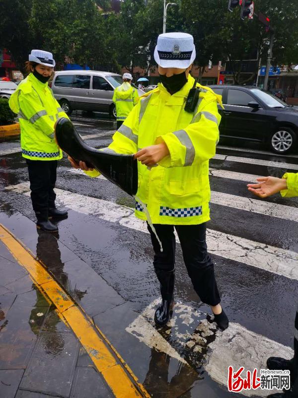 武安大隊(duì)民警倒出靴中的雨水。通訊員任玉媛攝