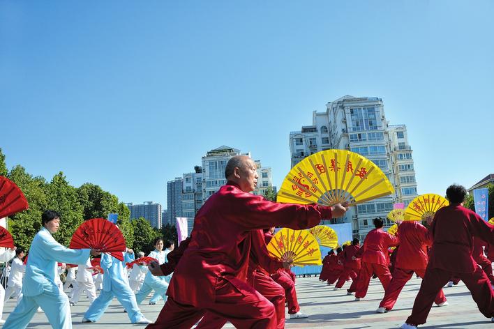 政通小區(qū)居民在小區(qū)廣場(chǎng)表演太極扇。 邯報(bào)融媒體記者李磊攝