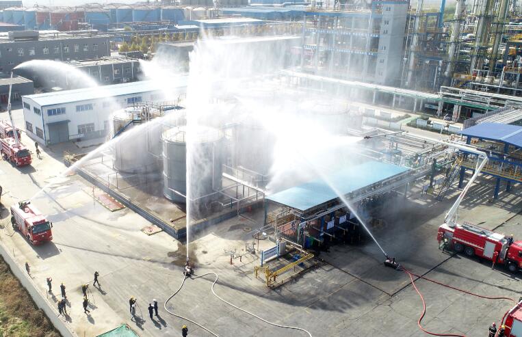 11月2日在河北省邯鄲市磁縣一家化工企業(yè)內(nèi)拍攝的化工企業(yè)應(yīng)急救援實戰(zhàn)演練現(xiàn)場(無人機照片)。