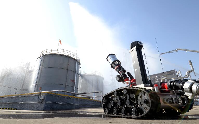 11月2日,在河北省邯鄲市磁縣一家化工企業(yè),“防爆消防滅火偵查機器人”參與到應(yīng)急救援實戰(zhàn)演練中。