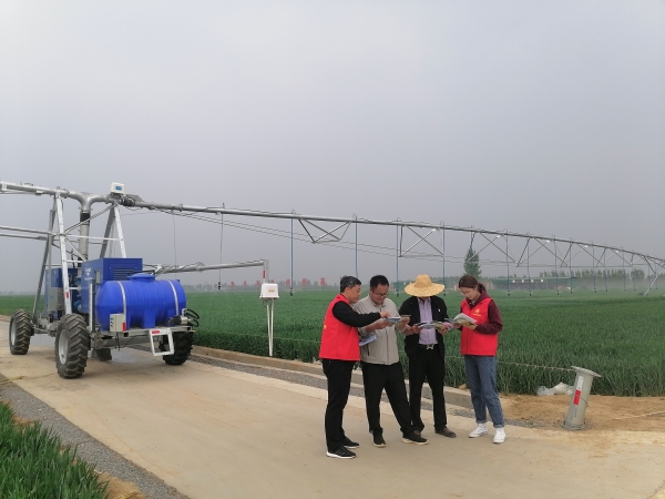 圖為,中國農(nóng)業(yè)大學(xué)雞澤實驗站育種基地根據(jù)氣象部門指導(dǎo)意見,利用現(xiàn)代大型噴灌切實進行澆水、施肥。邯報融媒體實習(xí)記者趙鴻粼 通訊員李向前攝影報道