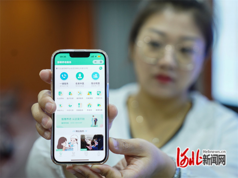 9月22日,負(fù)責(zé)運(yùn)營(yíng)邯鄲市“互聯(lián)網(wǎng)+養(yǎng)老”智慧平臺(tái)的邯鄲數(shù)港科技有限公司工作人員展示“邯鄲養(yǎng) 老服務(wù)”小程序。董源攝
