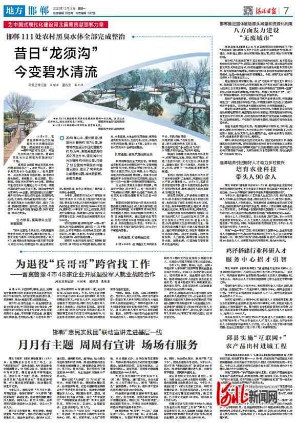 邯鄲是全國首批城市黑臭水體治理示范城市之一。2019年以來,針對(duì)農(nóng)村黑臭水體動(dòng)態(tài)變化大、長效監(jiān)管難、易返黑返臭等突出問題,該市堅(jiān)持源頭防控、系統(tǒng)整治,截至目前,累計(jì)新建、修復(fù)污水管網(wǎng)約107公里,新增城市生活污水日處理能力約16萬噸,清理河道淤泥約202萬立方米,建設(shè)城中村污水管網(wǎng)約466公里,新建餐廚垃圾處理廠并升級(jí)市內(nèi)62座垃圾轉(zhuǎn)運(yùn)站,在滏陽河、沁河、支漳河、渚河、輸元河等打造了12公里城市黑臭水體治理示范段,建設(shè)了北湖、西湖(園博園)、植物園、沁竹園、渚清園等10多處多功能濕地公園,城市更宜居、承載力更強(qiáng)。
