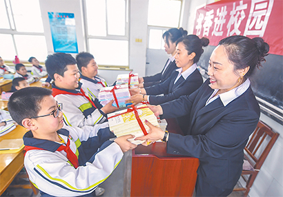 4月23日是世界讀書日。當日,阜城縣開展“書香進校園”主題活動,阜城縣新華書店工作人員為阜城縣第二小學(xué)五年級二班的學(xué)生送書。新華社記者李曉果攝