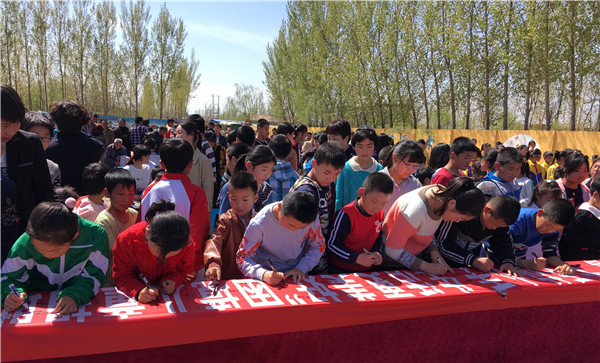 市婦聯(lián)聯(lián)合衡水市公安局開展“大手拉小手、生活更美好”困境兒童救助走進(jìn)阜城,圖為困境兒童們在捐助條幅上簽名。
