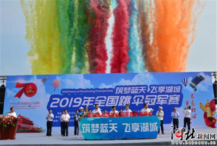 “2019年全國(guó)跳傘冠軍賽”開幕式于8月3日在衡水航空飛行營(yíng)地舉行,圖為賽事啟動(dòng)儀式現(xiàn)場(chǎng)。記者翟一杉攝