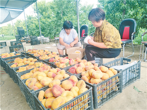 安平縣大子文鎮(zhèn)北郝村地處滹沱河中下游南岸,具有獨特的土質(zhì)、雨水少、高光照,適宜種植林果。近年來,該鎮(zhèn)大力發(fā)展庭院經(jīng)濟和林果經(jīng)濟,拓寬了村民的致富路,其中北郝村農(nóng)民張漢賓種植果樹類200畝,素有“黃金蟠桃”之稱的蟠桃樹30余畝,畝產(chǎn)量可達2500公斤。圖為漢濱果園農(nóng)民在將摘下的“黃金蟠桃”裝箱發(fā)貨。張佳攝